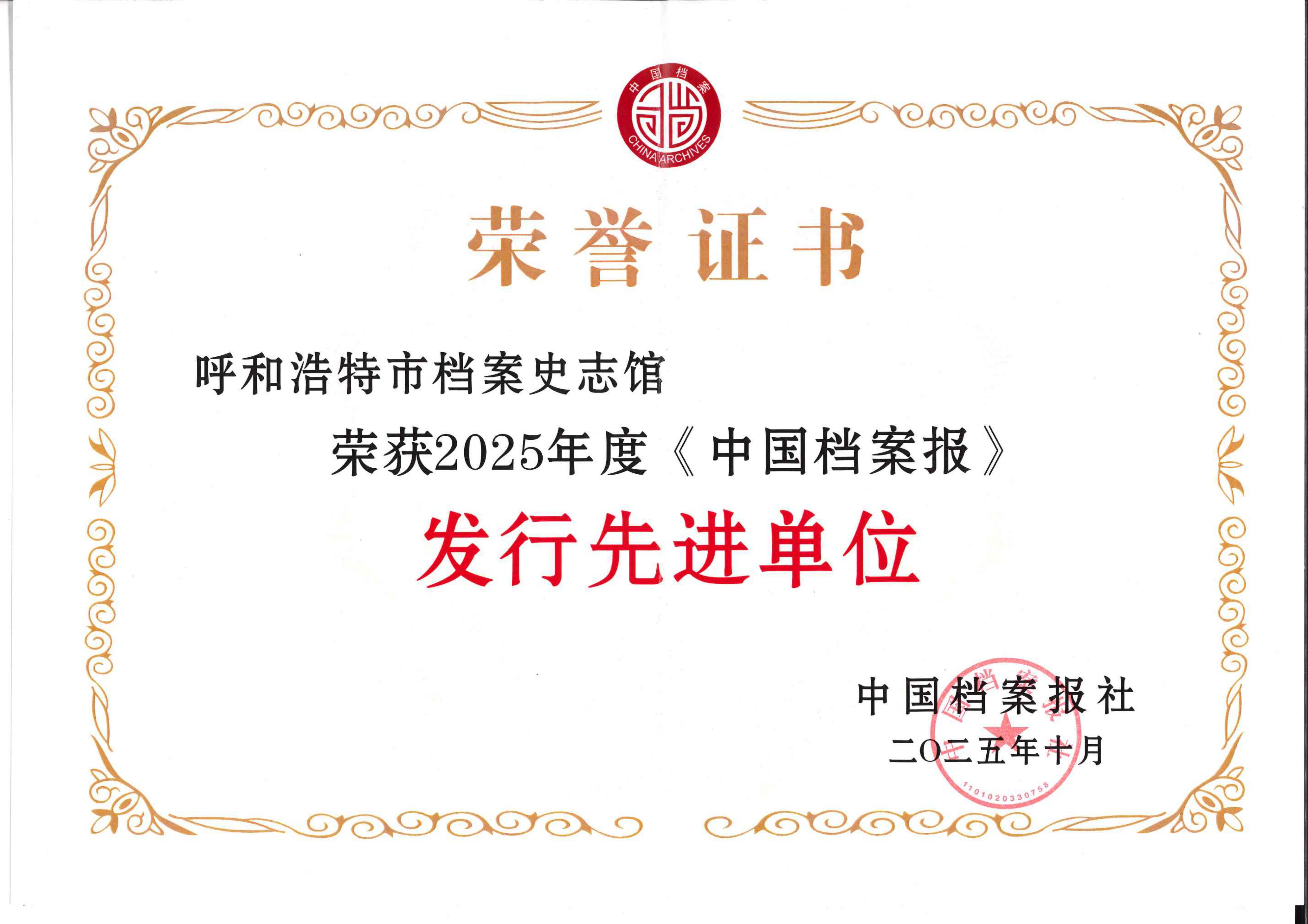 近日,中国档案报社印发《关于表彰2025年度优秀通联单位、优秀通联站站长、发行先进单位、发行先进个人、优秀特约通讯员、优秀撰稿组织者和优秀特邀撰稿人的通报》,呼和浩特市档案史志馆凭借扎实的宣传基础工作和广泛的档案文化影响力,获评“发行先进单位”称号。