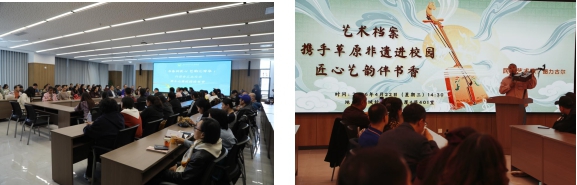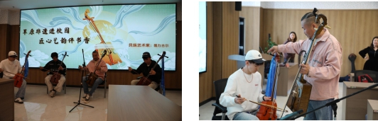 作为本届读书节的重磅环节,“艺术档案携手草原非遗进校园,匠心艺韵伴书香”主题活动精彩开启。活动特邀青年马头琴演奏者、呼麦演员图力古尔老师,为现场师生带来了一场关于马头琴与呼麦艺术的专题讲座与现场展演。马头琴与呼麦,作为蒙古族杰出的艺术瑰宝,均被列入联合国教科文组织人类非物质文化遗产代表作名录,承载着草原民族与天地自然对话的精神内核。图力古尔老师自幼随其父——自治区级马头琴制作技艺传承人乌力吉学艺,兼具演奏与制作的深厚底蕴。在讲座中,他不仅生动讲述了这两项非遗艺术的起源与发展,更深入浅出地介绍了马头琴的结构选材、制作工艺、分类及演奏技法。尤为令人印象深刻的是,图力古尔老师分享了与父亲共同为2008年北京奥运会开幕式制作128把演奏马头琴的难忘经历,点滴细节中无不透露出匠人对艺术的执着与敬畏。