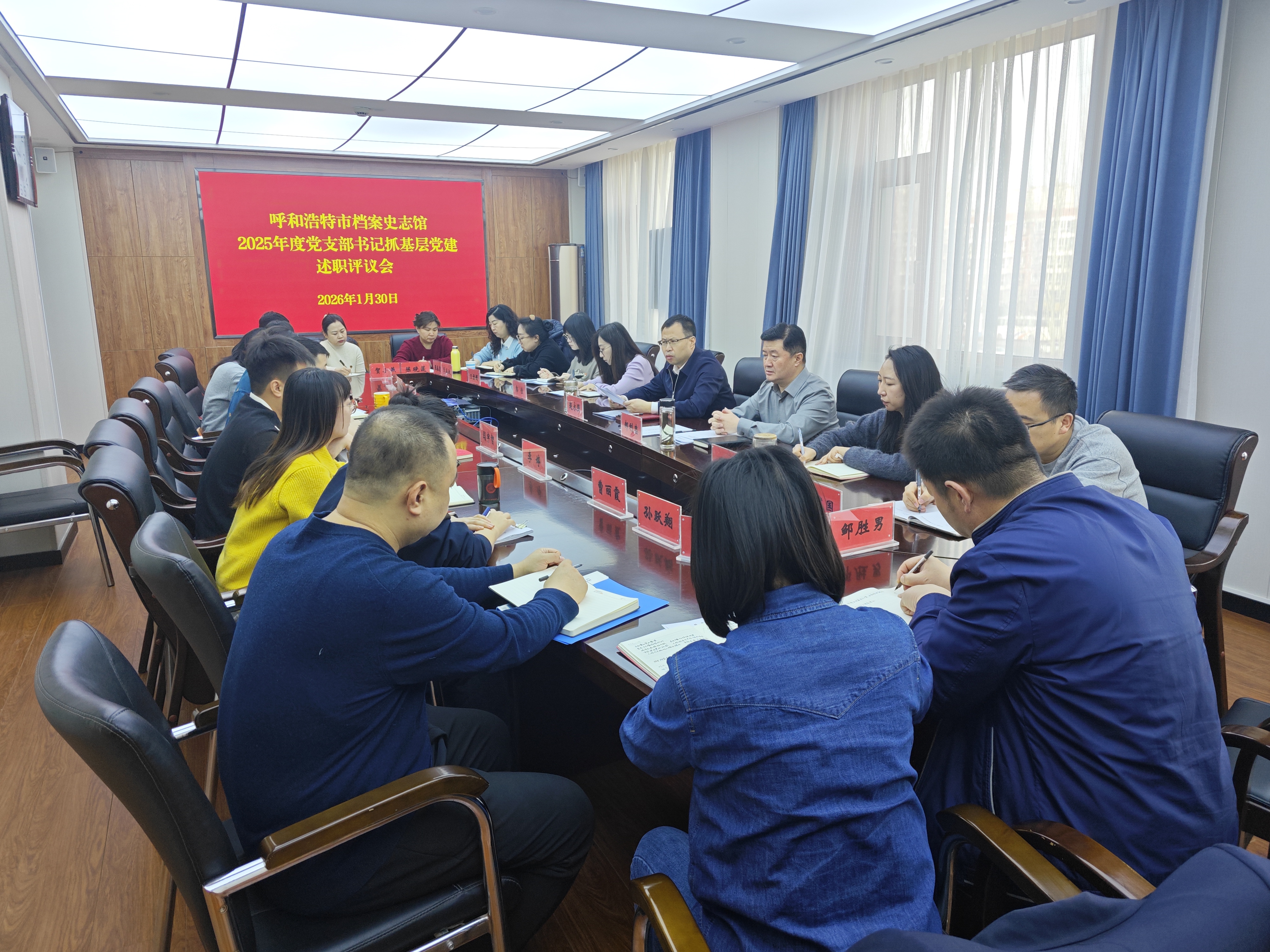 1月30日,呼和浩特市档案史志馆召开2025年度党支部书记抓基层党建述职评议会,机关党总支书记、馆长赵永强主持会议并讲话,机关党总支委员、副馆长郝利忠参加,党总支委员、各党支部书记、支部委员、党员代表、群众代表参加会议。