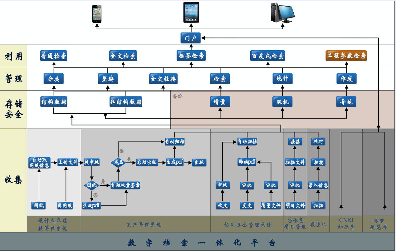 数字档案管理一体化平台是一个档案全过程管理的数字化信息系统,包括成品档案、原始档案、文书档案、科研档案等13种档案。覆盖公司各个方面的工作。数字档案管理系统功能满足本单位各门类、各载体档案和资料的收集、整理、存储、检索、传递、保管、保护、利用、鉴定、统计、安全保障等全过程管理。实现了内部新增档案信息的全部数字化和矢量文件的自动归档以及历史档案信息的据实数字化。各系统之间流程衔接顺畅,通过自动收集功能和归档的接口使生产过程中形成的所有DWG图纸、OFFICE文档、PDF文档等电子文件自动收集、整理、归类、转化、存储全部自动化完成,整个过程人工零干预,减少了归档人员的工作量,提高了归档效率和准确性。通过强大的检索功能、在线浏览及下载、业务办理流程化、无纸化办公等服务,为档案利用打开方便之门,为档案资源转换为企业生产力提供了有效途径。平台具备“收集、管理、保存、利用”等功能,保证了馆藏档案和资料信息真实、完整、可用。具有先进水平,有独创性,功能强,技术含量高等特点。它把分散于不同载体不同地理位置的信息资源以数字化的形式存贮,以网络方式互相联结,从而提供及时利用,实现知识管理的资源共享。平台引入了成品档案密级管理、成品的深度挖掘利用、全文检索等功能,使数字档案管理一体化平台迈向知识管理。