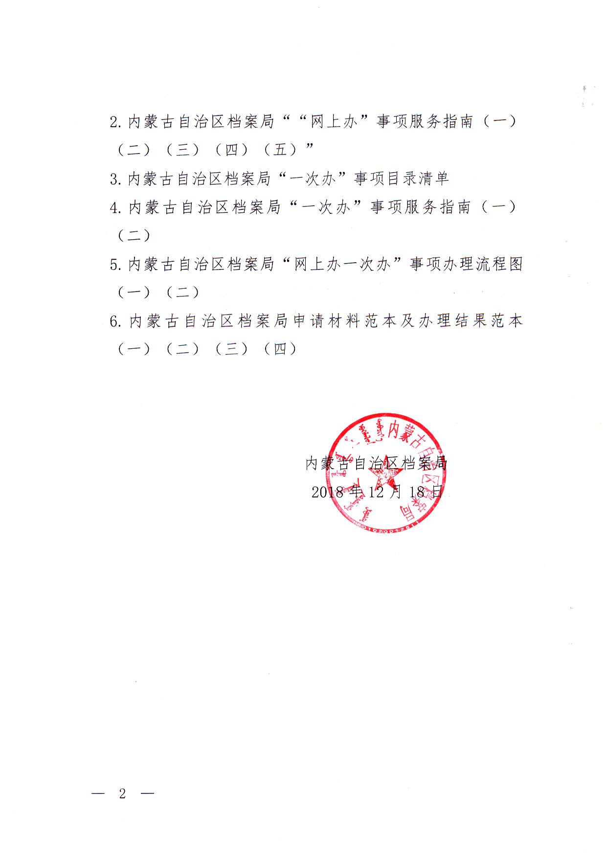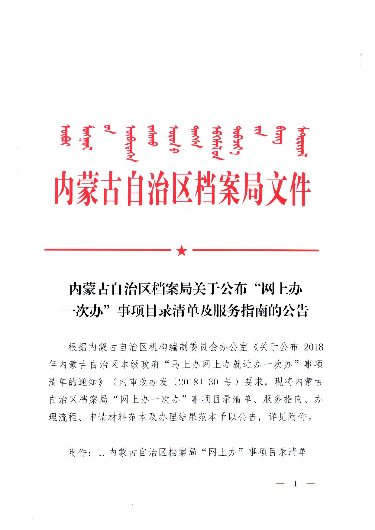 内蒙古自治区档案局关于公布“网上办 一次办”事项目录清单及服务指南的公告