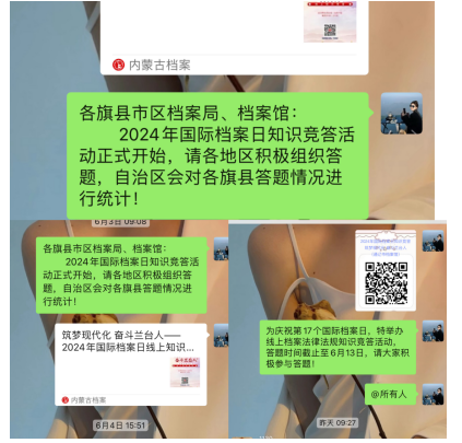 积极组织全市各地各部门参加国家档案局、自治区档案局、档案馆以及通辽市档案馆开展的档案法律法规线上知识有奖竞答活动,截止目前,全市共426人参加通辽市档案馆组织的线上档案知识竞答,切实增强档案法治意识,扩大档案工作影响,提升档案工作社会知晓率、参与率、满意率。
